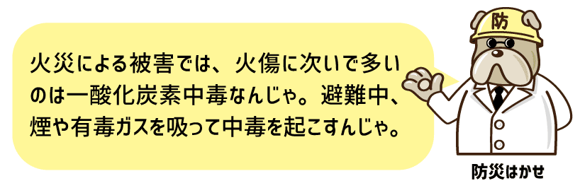 災時の避難は濡れた布巾やハンカチで鼻と口を覆い煙や有毒ガスを防ぐことを、防災訓練などで周知してもらいましょう。
